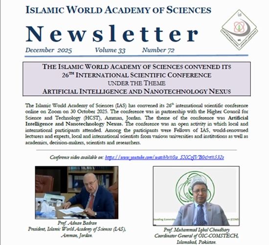 آکادمی علوم جهان اسلام (IAS) در ۳۰ اکتبر ۲۰۲۵ با همکاری شورای عالی علوم و فناوری اردن، بیست و ششمین کنفرانس علمی بین المللی خود را با محور «پیوند هوش مصنوعی و نانوتکنولوژی» بهصورت آنلاین برگزار کرد.