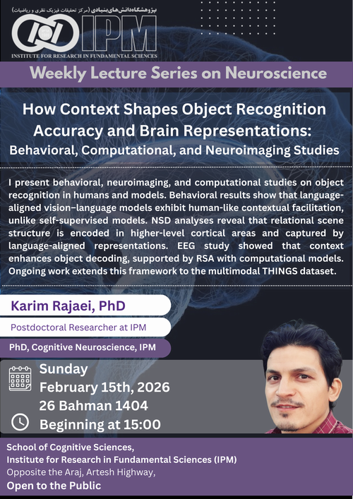 در ادامه سلسله سخنرانی‌های هفتگی علوم اعصاب، نشست تخصصی با عنوان «چگونه متن صحنه بر دقت بازشناسی اشیاء و بازنمایی‌های مغزی تأثیر می‌گذارد» روز یکشنبه ۲۶ بهمن‌ماه ۱۴۰۴ در پژوهشگاه دانش‌های بنیادی (IPM) برگزار خواهد شد.