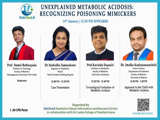 وبینار علمی بین‌المللی با عنوان «Unexplained Metabolic Acidosis: Recognizing Poisoning Mimickers» روز سه‌شنبه ۱۴ ژانویه ۲۰۲۶ از ساعت ۱۲:۰۰ ظهر به‌صورت آنلاین برگزار خواهد شد. این برنامه علمی به همت مرکز اطلاعات و تحقیقات مسمومیت‌های کودکان KidsToxLK و با همکاری کالج متخصصان کودکان سریلانکا (Sri Lanka College of Paediatricians) سازمان‌دهی شده است.