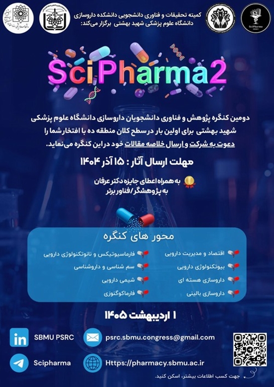 مرکز تحقیقات علوم دارویی | تمدید مهلت ارسال خلاصه‌ مقالات به دومین کنگره SciPharma تا ۳۰ آذر ۱۴۰۴