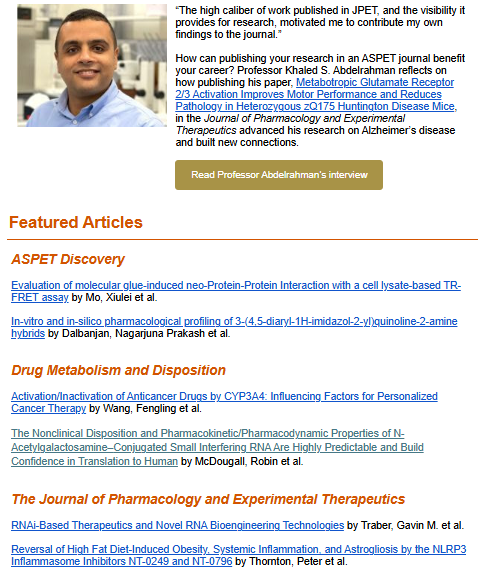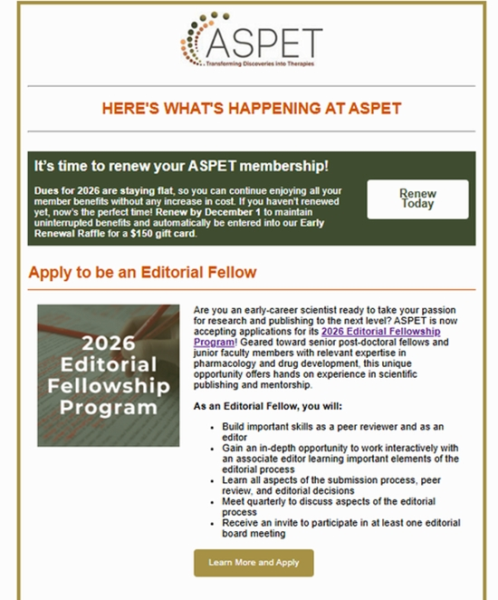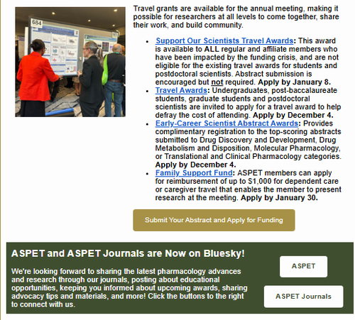 مرکز تحقیقات علوم دارویی | خبرهای این هفته از ASPET: فراخوان برنامه کمک‌هزینه تحریریه، بورسیه سفر ASPET 2026 و سایر فرصت‌ها!