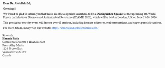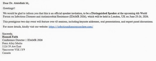 دکتر محمد عبداللهی، استاد برجسته و عضو هیئت علمی دانشگاه علوم پزشکی تهران، به‌ صورت رسمی به‌عنوان سخنران ممتاز (Distinguished Speaker) برای حضور در چهارمین مجمع جهانی بیماری‌های عفونی و مقاومت ضد میکروبی (4th World Forum on Infectious Diseases and Antimicrobial Resistance – IDAMR 2026) دعوت شد.