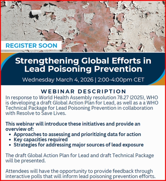 سازمان جهانی بهداشت (WHO) در پی تصویب قطعنامه WHA78.27 (۲۰۲۵)، در حال تدوین پیش‌ نویس برنامه اقدام جهانی برای کاهش مسمومیت با سرب و بسته فنی پیشگیری از مسمومیت با سرب با همکاری Resolve to Save Lives است. وبینار بین‌المللی «تقویت تلاش‌های جهانی در پیشگیری از مسمومیت با سرب» در تاریخ ۴ مارس ۲۰۲۶ برگزار می‌شود و ضمن معرفی این ابتکارات، فرصت ارائه بازخورد تعاملی به شرکت‌کنندگان نیز فراهم خواهد شد.