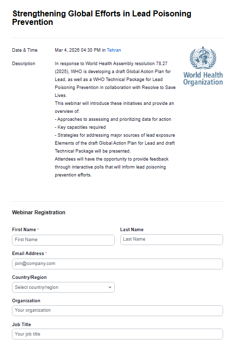 علاقه‌ مندان و فعالان حوزه سلامت می‌توانند با ثبت‌ نام در این وبینار، از جدیدترین دستاوردها، تجربیات جهانی و راهکارهای عملی پیشگیری از مسمومیت با سرب بهره‌مند شوند.